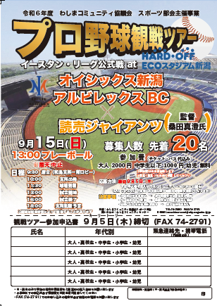 9/15(日)エコスタにて開催される、オイシックス新潟アルビレックスBC対読売ジャイアンツの観戦を一緒に行きませんか?しかも・・・今回は桑田真澄監督率いる★読売ジャイアンツ戦★です!!募集人数は先着20名です。お早目の申し込みお待ちしております(^^♪