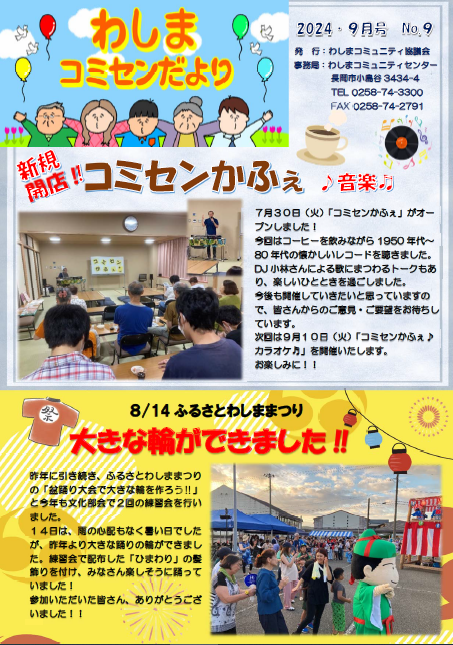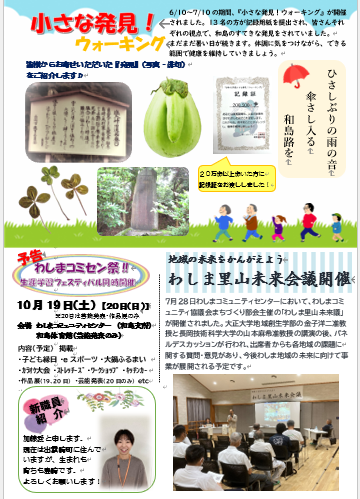 コミセンだより9月号が完成しました。7月に初開催された「コミセン音楽かふぇ」や、わしま祭などについての記事が載っています。裏面には、皆さんからいただいたウォーキングでの「小さな発見」や、里山未来会議などついて掲載しましたのでご覧ください♪